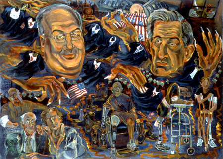 ALLEN SCHMERTZLER Political Paintings -- The Bush Years Schmertzler usually works ala-prima ... paint directly applied on the surface without underdrawings. Often, but not always, he draws studies before he starts. The underpinnings of all of the paintings are very lose and gestural figures splashed on with colorful and wet acrylic paint in a "reckless" manner to create mood and accidents from which to work. He incorporates historical artist's motifs to choreograph, design, structure, or mood of a current political-social theme and to give it a spin. |