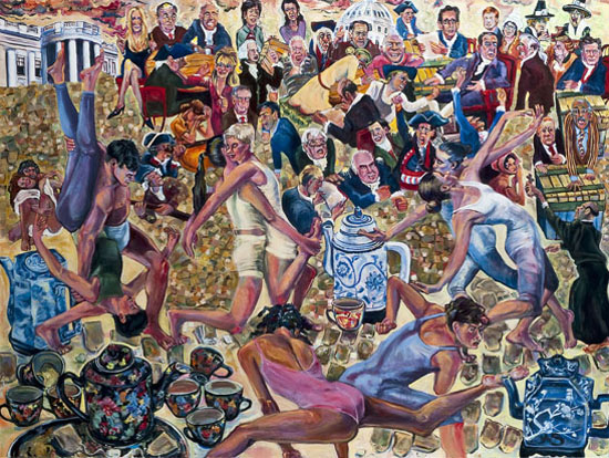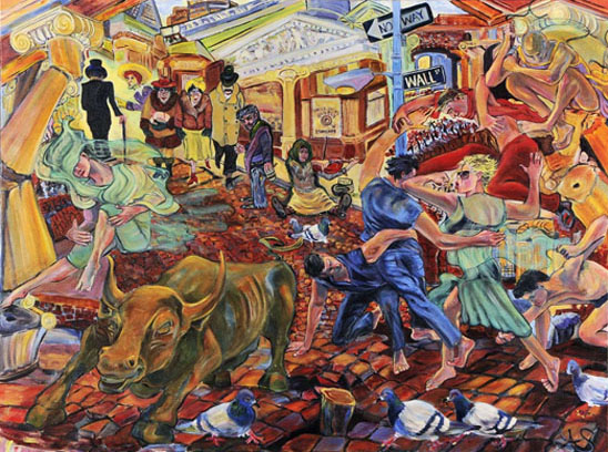 ![]() 1st Place Winner of the American Art Award 2010 in the Political Commentary category. Wall Street Boogie-Woogie acrylic on canvas 40" X 30" |