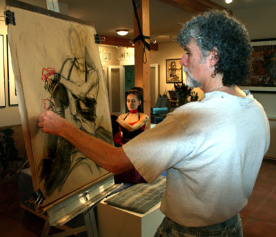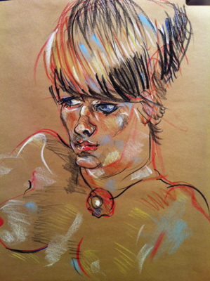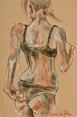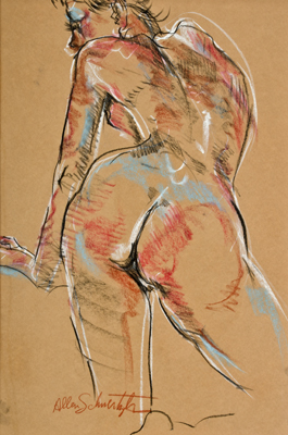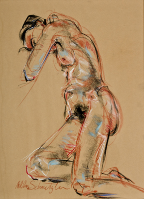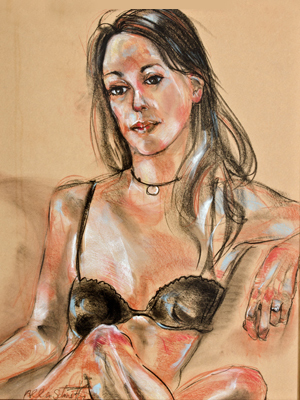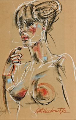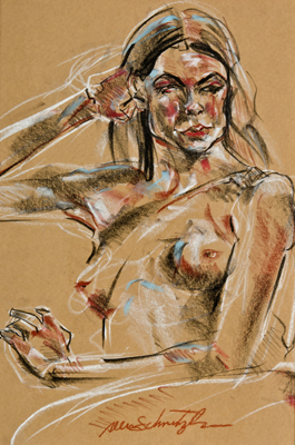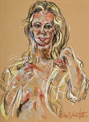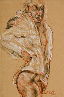 Schmertzler's "of the moment", energized, and spirited short gesture poses drawn from life, capture each model's unique attitude, mood, drama and structure. Individual 2 to 3 hour alive life drawing sessions are available on a fee-by-project basis. It is a less expensive and certainly less formal alternative and possibly more expressive than a portrait. Choose nude, clothed or costumed. Being framed as an expressive figure drawing is a great gift for any occasion.